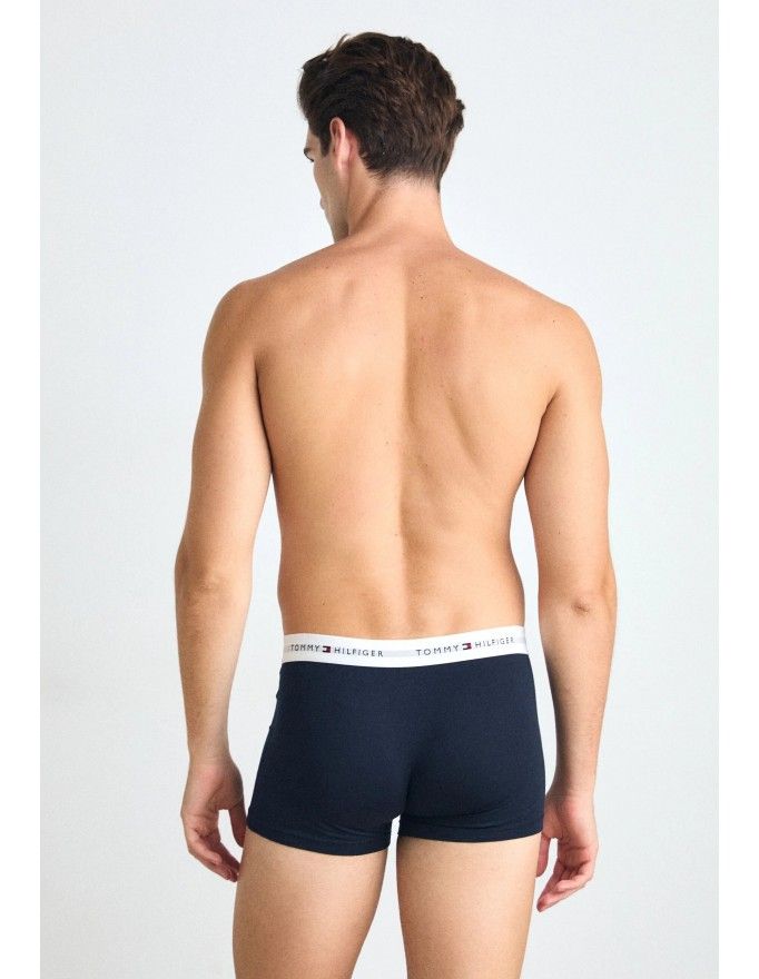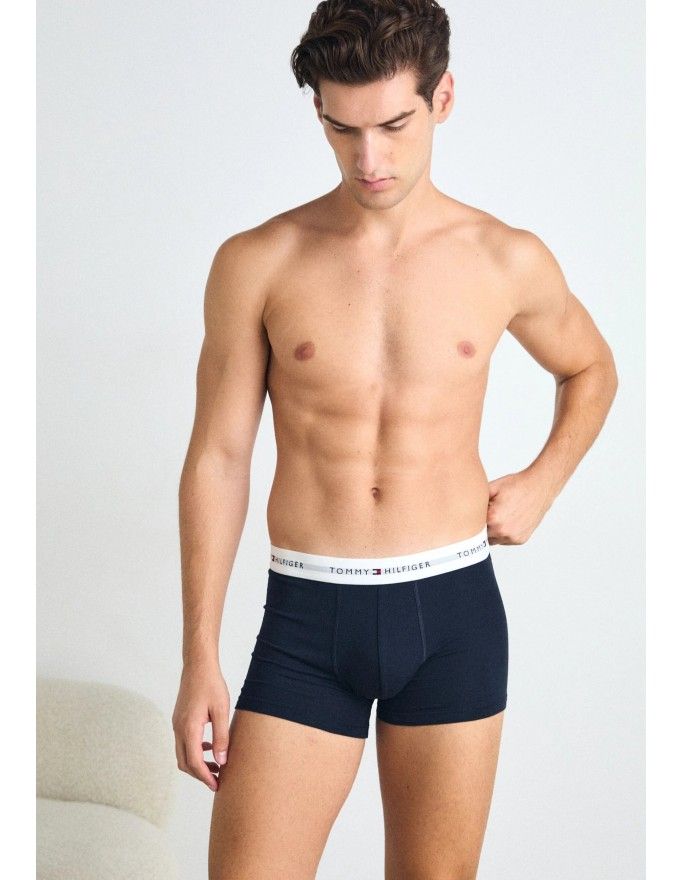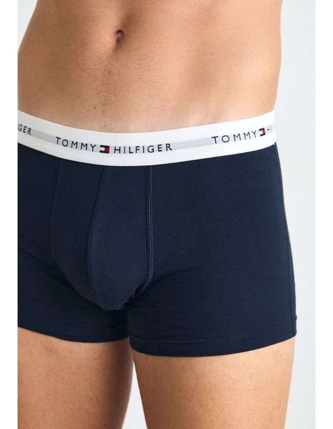 Pack de 3 bóxer Tommy Hilfiger Signature Cotton Essentials en color marino con la cinturilla roja, blanca y marino.