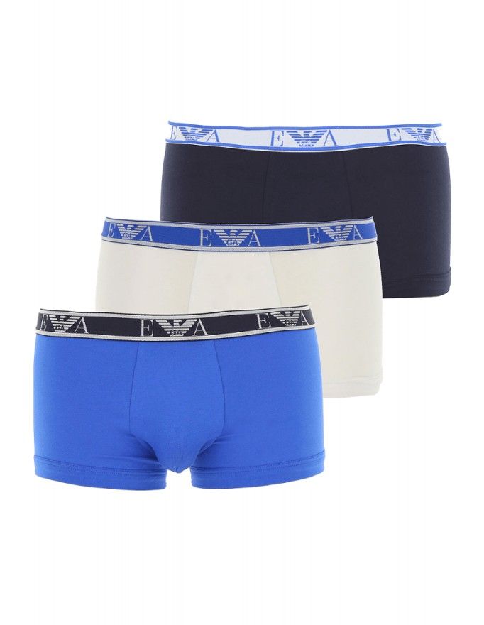 Pack de 3 bóxer Emporio Armani en colores azul, blanco y marino con la cinturilla a contraste.