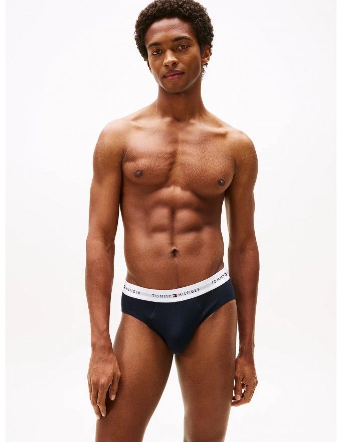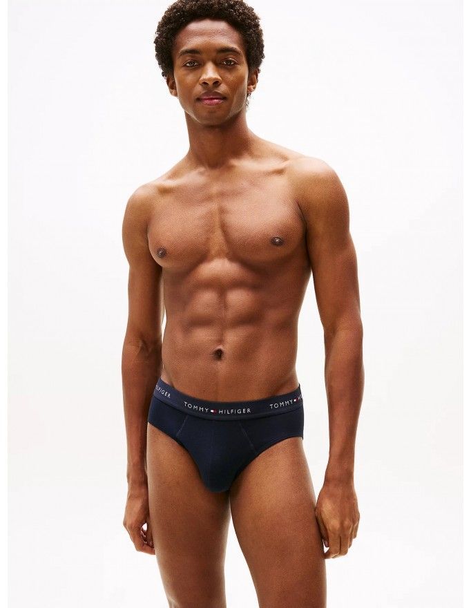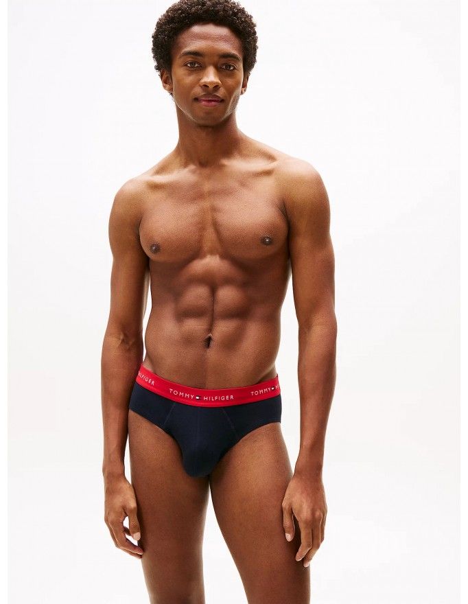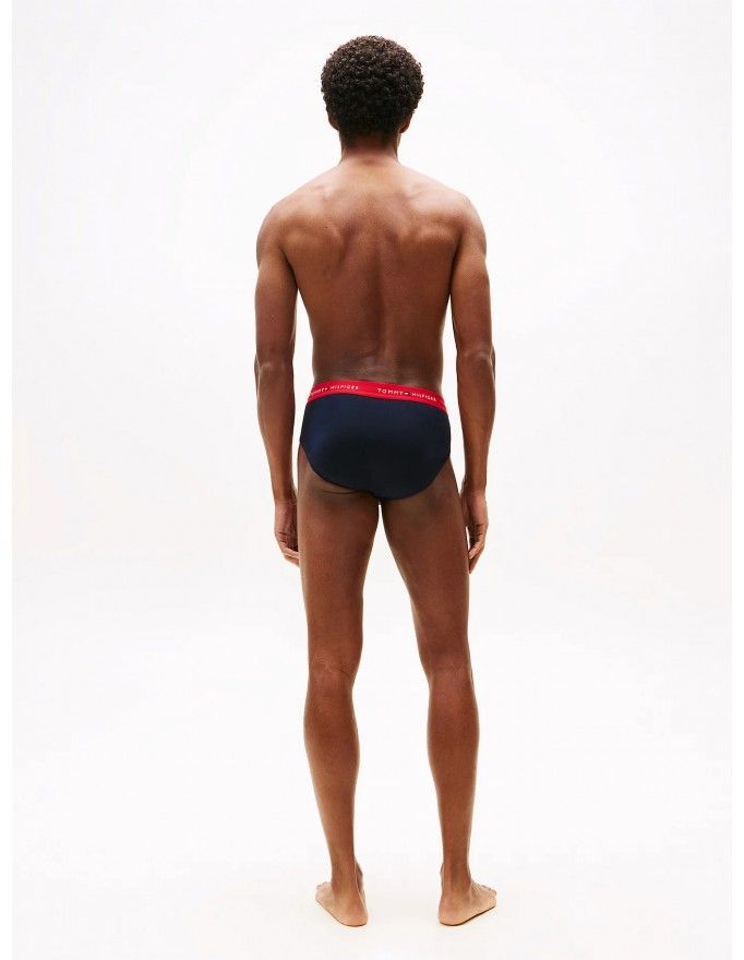 Pack de 3 slip Tommy Hilfiger Signature Cotton Essentials en color marino con la cinturilla roja, blanca y marino.
