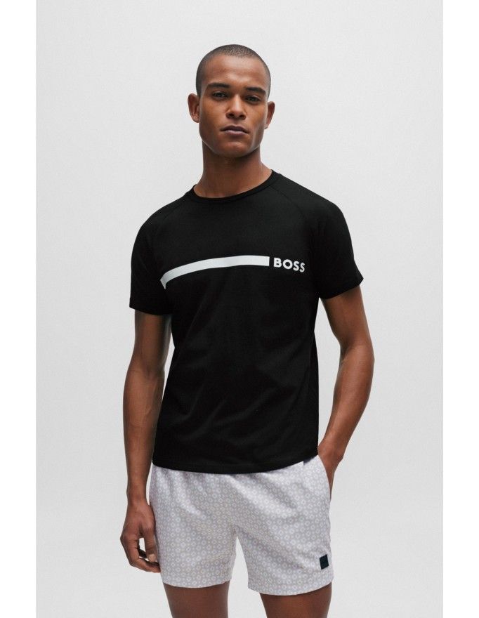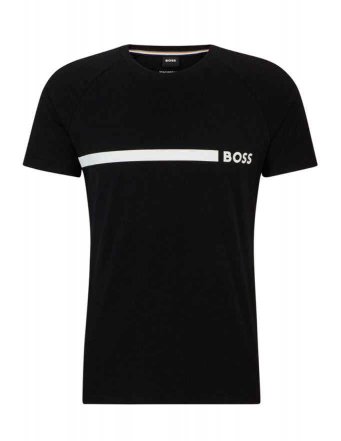 Camiseta Boss Slim Fit 100% algodón de manga corta con raya y logo estampado en color negro.