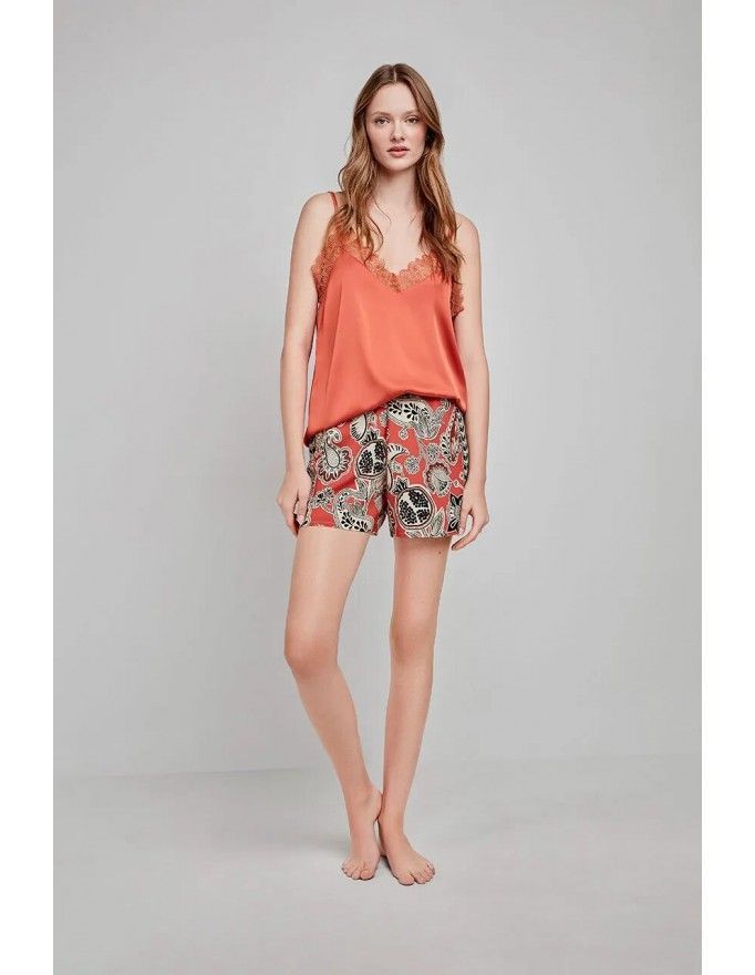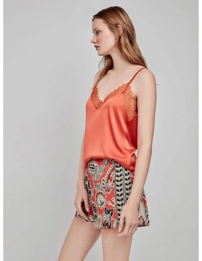 Pijama de mujer Gisela de tirantes de tejido satinado con estampado tribal en color caldera.