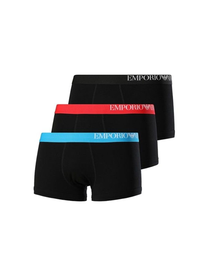 Pack de 3 cuecas Emporio Armani Stretch Cotton de cor preta com cintura azul, preta e vermelha.
