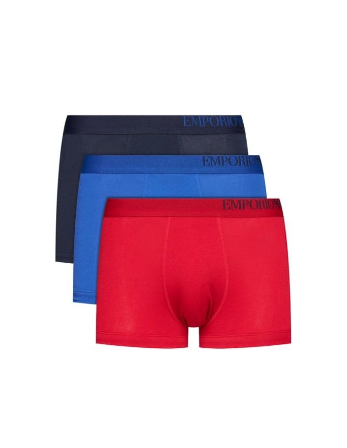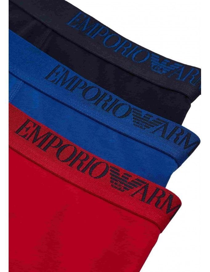 Pacote de 3 boxers Emporio Armani de algodão stretch nas cores vermelho, azul e marinho.