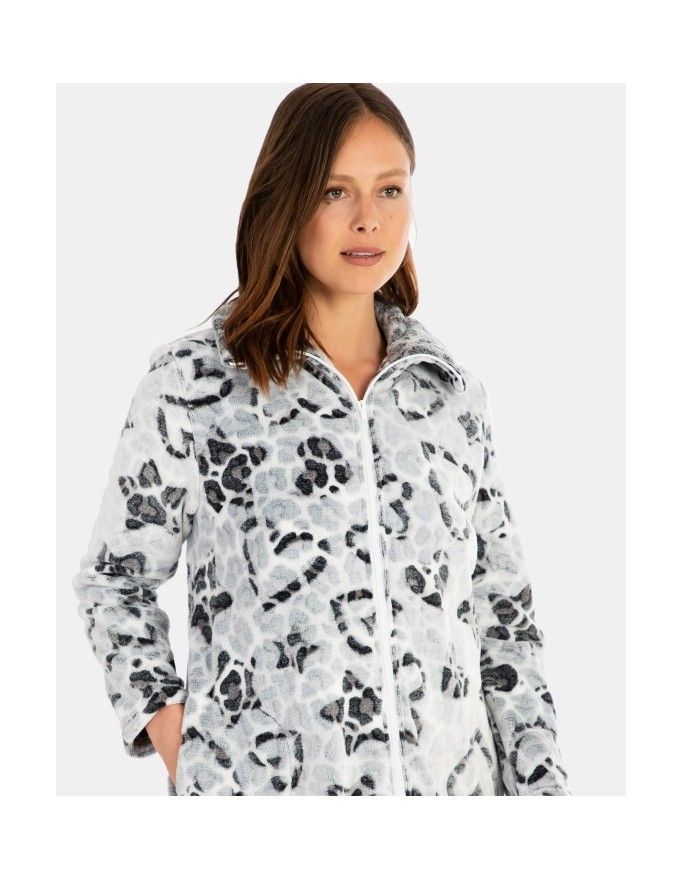 Robe curto feminino Massana de tecido polar com estampa nights em cores cinza e rosa. Bonito robe curto Massana com fecho de correr e bolsos laterais. Estampa na parte externa e interna, punhos e bainhas contrastam com tecido liso na cor rosa. Macio, confortável e quentinho para ficar em casa.
