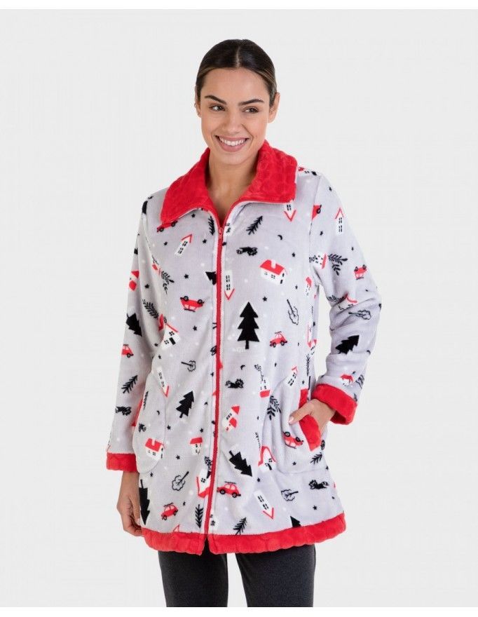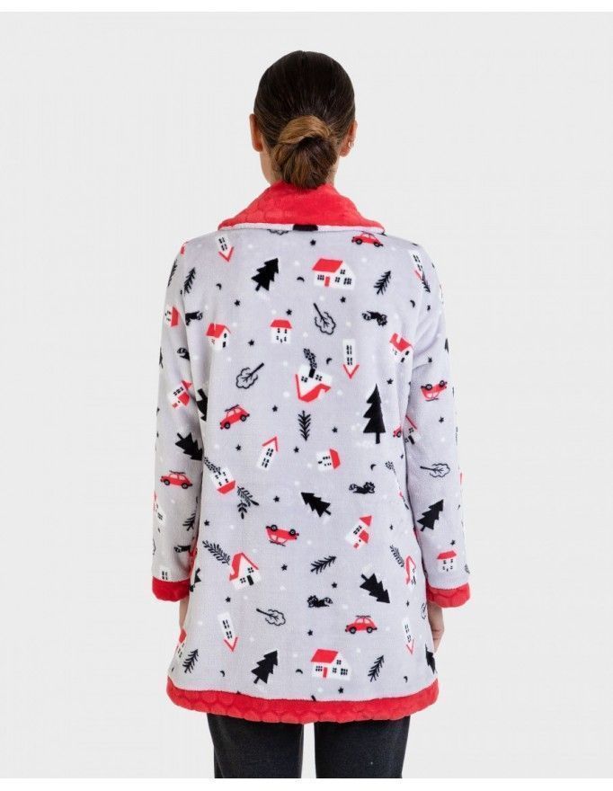 Roupão feminino Massana de tecido polar com estampa de motivos natalinos na cor cinza.